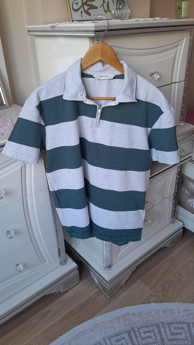 gri ve koyu yeşil çizgili, fermuar yakalı kısa kollu pamuklu polo tişört. Rahat kesim, günlük sokak stili için uygundur.