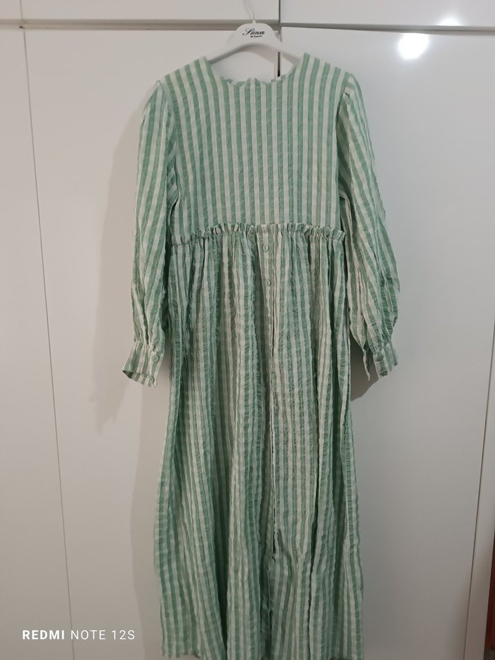 Yumuşak sentetik kumaştan yapılmış, düğmeli ve kayık yakalı bol kesim hamile bluzu. Pastel yeşil çizgili, askılı kollu ve kısa boyda, günlük kullanıma uygun.