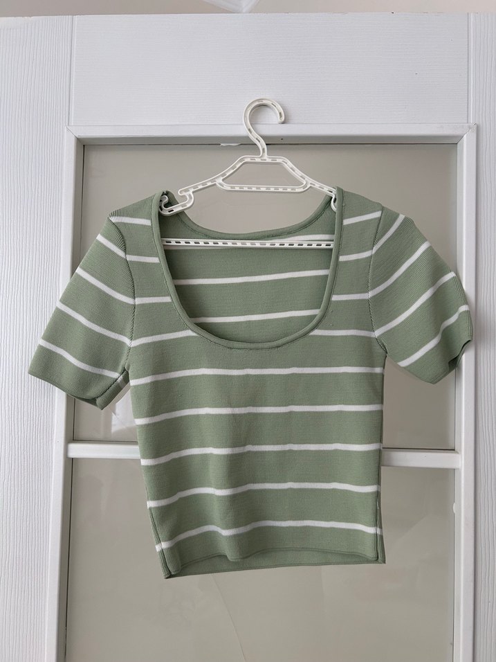 Yumuşak örme kumaştan yapılmış, kısa kollu ve yuvarlak yakalı yeşil çizgili crop top. Günlük rahat sokak stili için uygundur.