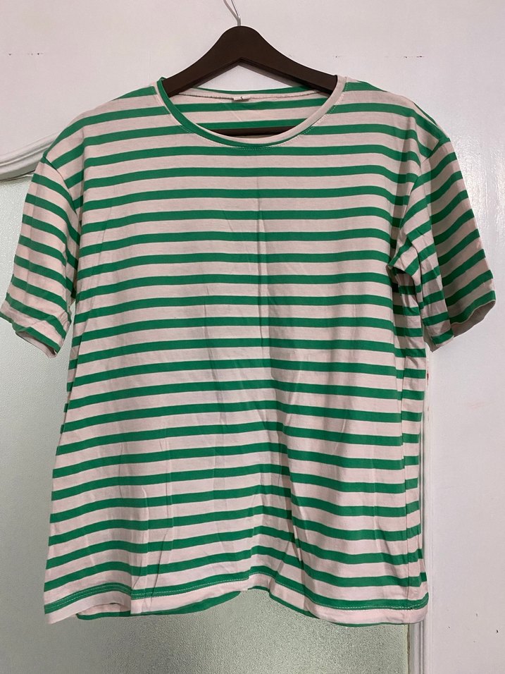 Kadınlar için kısa kollu, yuvarlak yakalı,, yeşil-beyaz çizgili bol kesim tişört. Günlük rahat kullanım için uygundur.