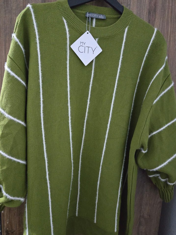 Yeşil renkte, uzun kollu ve bisiklet yakalı, çizgili triko kazak. Rahat kesimiyle günlük sokak stiline uygundur.