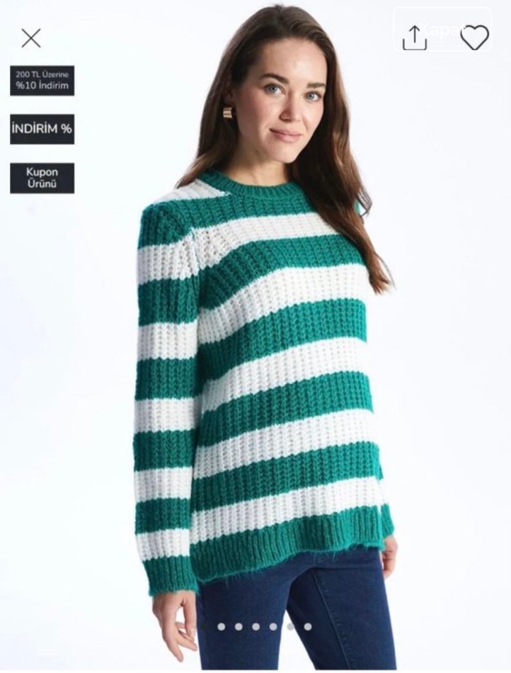 açık yeşil çizgili triko kazak, bisiklet yaka ve uzun kolludur. Rahat kesimi ve normal boyuyla gündelik kullanıma uygundur.