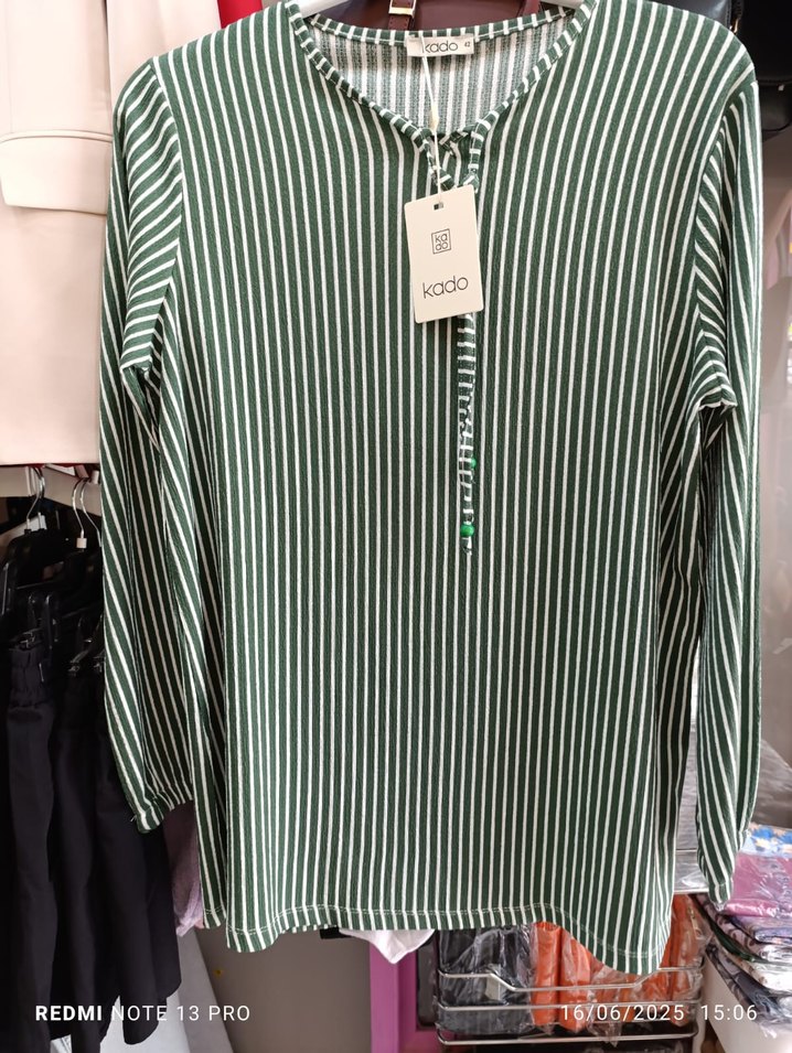 Yeşil ve beyaz çizgili, uzun kollu salaş kadın gömlek. Bisiklet yaka ve pile detaylı, yumuşak sentetik kumaştan üretilmiştir. Günlük rahat sokak stili için uygundur.