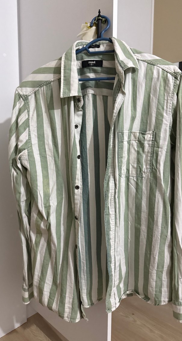 Uzun kollu, düğmeli, yakalı keten erkek gömlek. Pastel yeşil çizgili, normal boy ve rahat kesim. Günlük ve sokak stiline uygun.