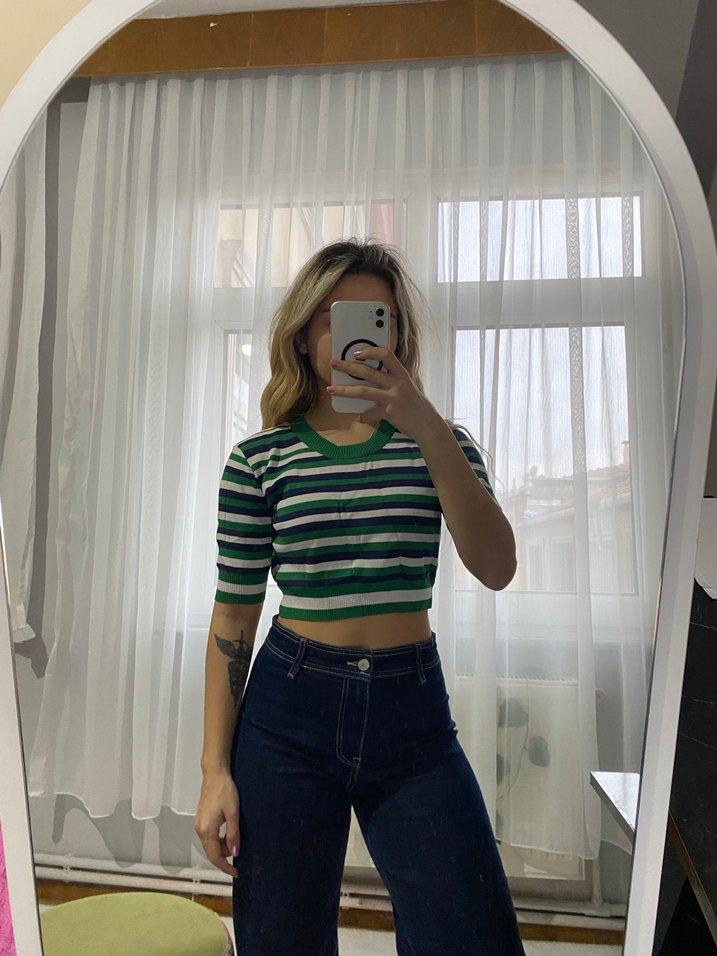 Yeşil çizgili, kısa kollu, bisiklet yaka ve denim kumaştan yapılmış fitted crop top. Trendy sokak stili için uygun. Ürün 2 defa kullanıldı kumaşı çok rahat