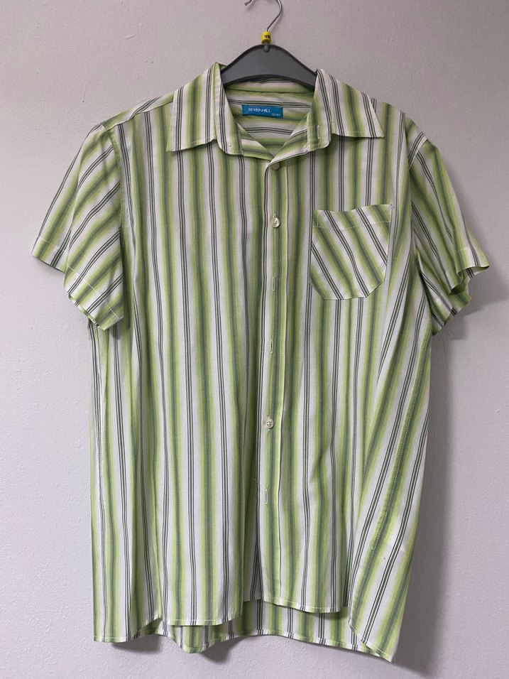 Kısa kollu, düğmeli ve yakalı gömlek. Pastel yeşil çizgili, göğüs cebine sahip, rahat kesim ve sentetik yumuşak kumaştan üretilmiştir.