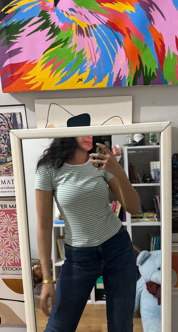 Yeşil çizgili, kısa kollu ve düz yuvarlak yakalı, dar kesim.1 kere giydim annem seviyor diye ben yeşil insanı değilim :) defosu yok