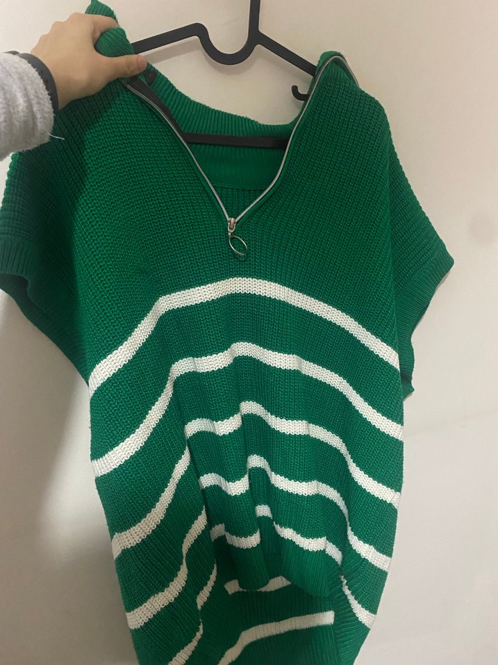 Yeşil renkli, beyaz çizgili kolsuz triko kazak. Yuvarlak yaka ve bol kesim, midi boyda, günlük rahat stil için uygun.