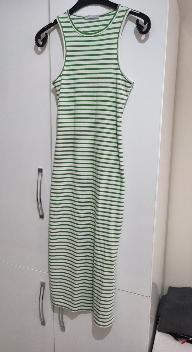 Yeşil Çizgili Kolsuz Uzun Elbise