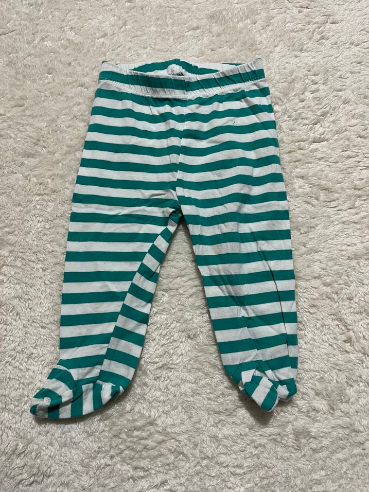 Yeşil ve gri çizgili, örgü yapıda, fitted kesim erkek çocuk pantolonu. Sokak stili için uygun, rahat ve temel tasarım. Ebebek ürünü 6 aya uygun çoraplı pijama