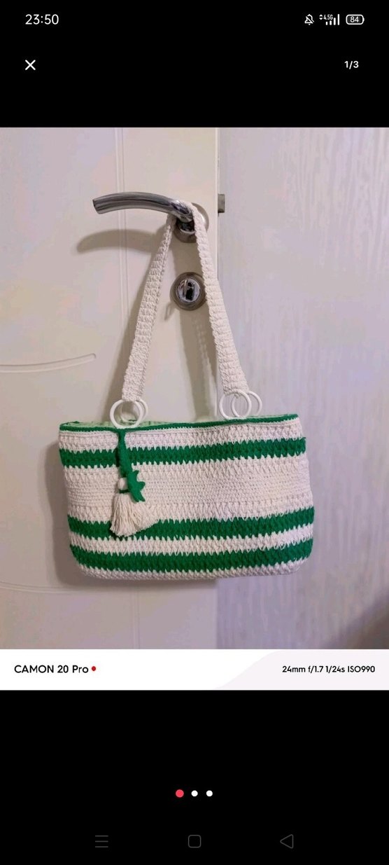 Hafif yeşil çizgili, örgü dokulu kadın çantasıdır. Bohem tarzı ve minimalist retro havası ile günlük kullanıma uygundur.