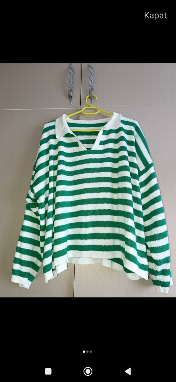 Uzun kollu, yakalı ve örgü kumaştan yapılmış bu kadın kazak, hafif yeşil-beyaz çizgili desene sahip ve bol kesimdir. Rahat sokak tarzı için uygundur.