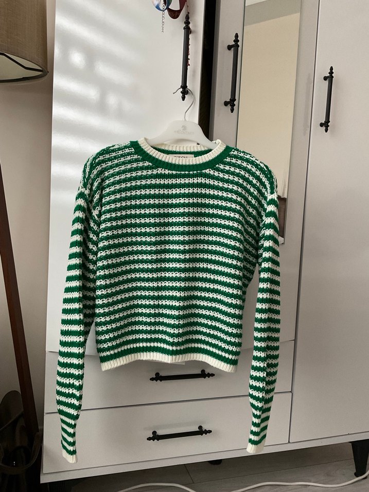 Yeşil ve beyaz çizgili, uzun kollu, yuvarlak yaka, örgü kumaştan yapılmış, rahat kesimli kadın kazak. Günlük kullanıma uygun, rahat ve şık bir parça.