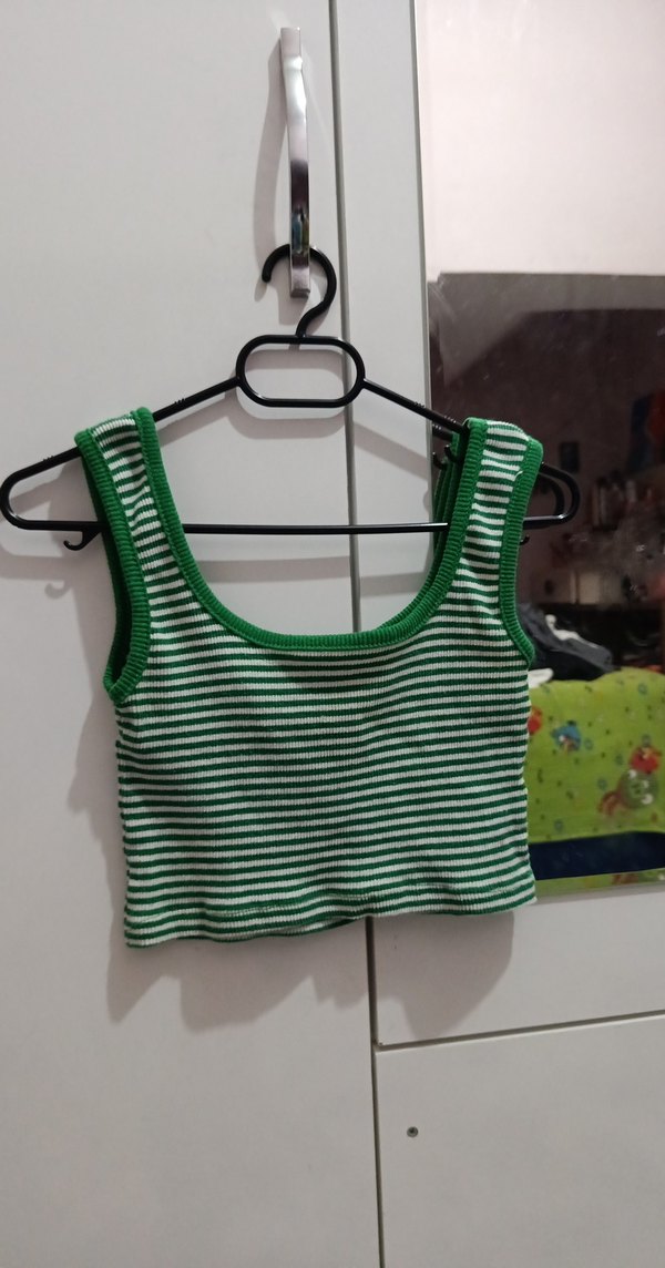 Yeşil renkli, çizgili örgü mini atlet, straplez yaka ve dar kesimiyle günlük sokak tarzına uygundur.