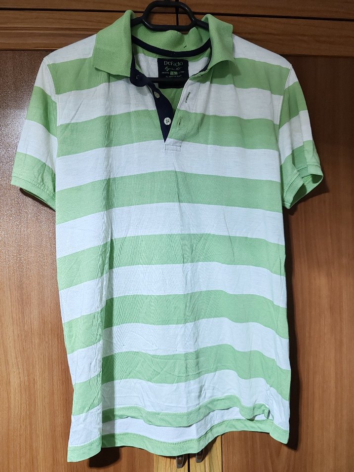 Pamuklu, kısa kollu, yakalı ve düğmeli erkek polo tişörtü. Gevşek kesim, pastel yeşil ve beyaz çizgili, günlük sokak stili için uygun. en 44 boy 67 cm