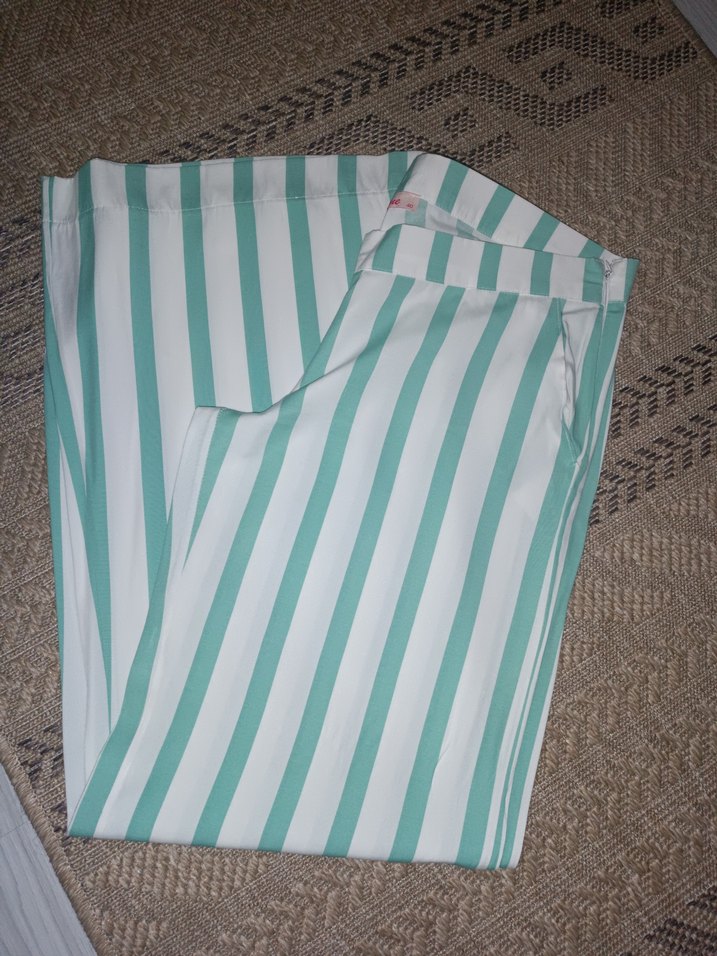 Uzun paçalı, Su yesili çizgili kadın ince Keten pantolon, pilili ve regular fit. Yumuşak sentetik kumaştan, günlük rahatlık için uygundur.