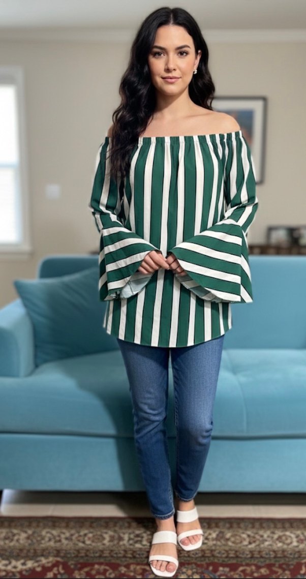 Bu kadın bluz, kayık yaka ve pilili uzun kollara sahiptir. Yeşil parlak çizgili deseniyle bol kesim, günlük rahat sokak stili için uygundur.