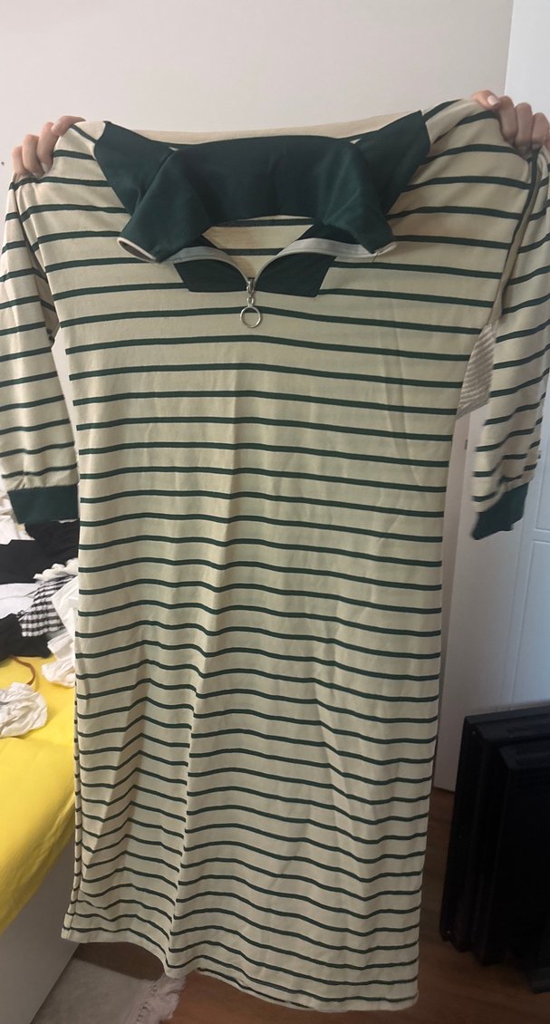 Yeşil ve gri çizgili, kısa kollu, polo yakalı ve fermuarlı. Sentetik kumaştan, rahat ve şık günlük kullanım için uygundur.