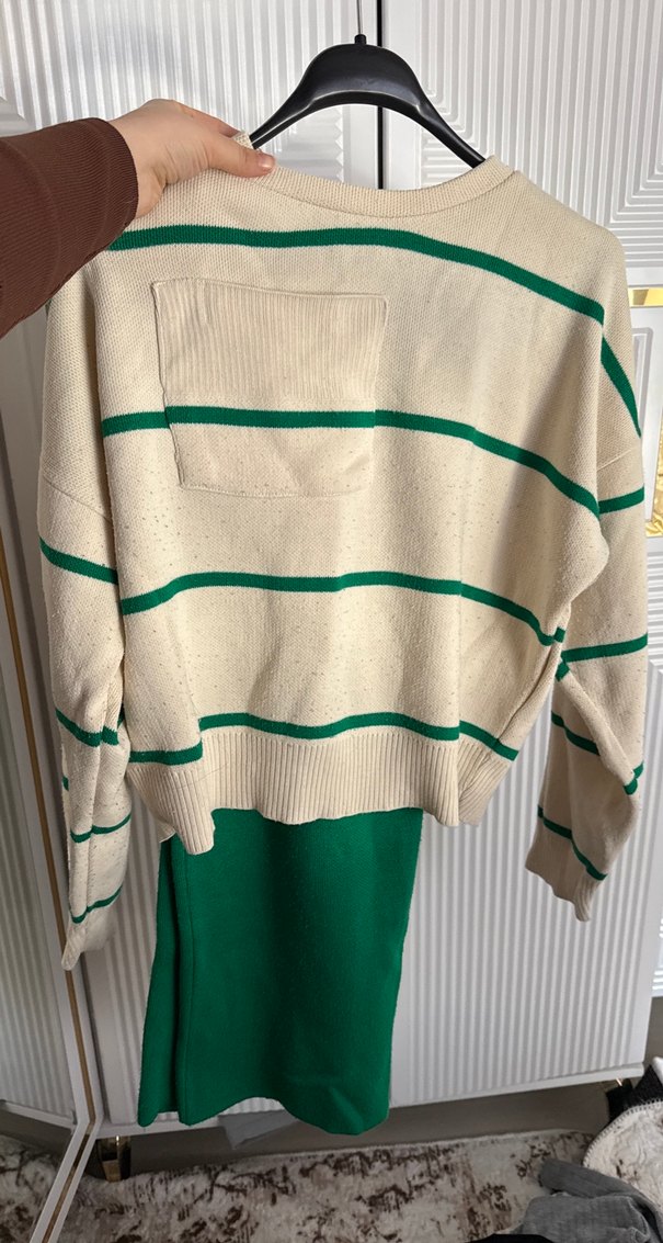 Uzun kollu, yuvarlak yaka, yeşil çizgili salaş triko takım, rahat ve günlük kullanıma uygun.