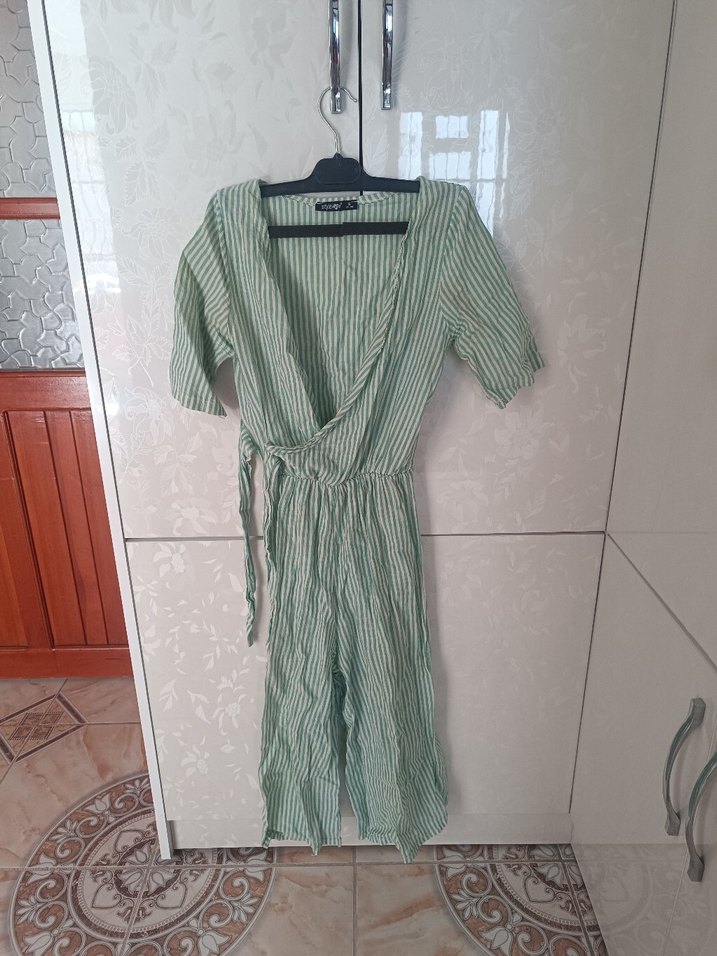 Yumuşak keten kumaştan yapılmış, V yaka ve pile detaylı, bol kesim kapri boy tulum . Pastel yeşil çizgili, rahat ve günlük stil.