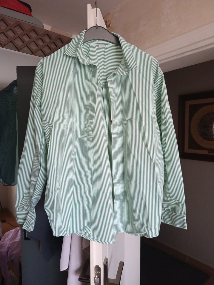 Pastel yeşil renkte, yakalı ve düğmeli, yumuşak keten kumaştan üretilmiş, bol kesim uzun kollu gömlek. Günlük rahat sokak stili için uygundur.