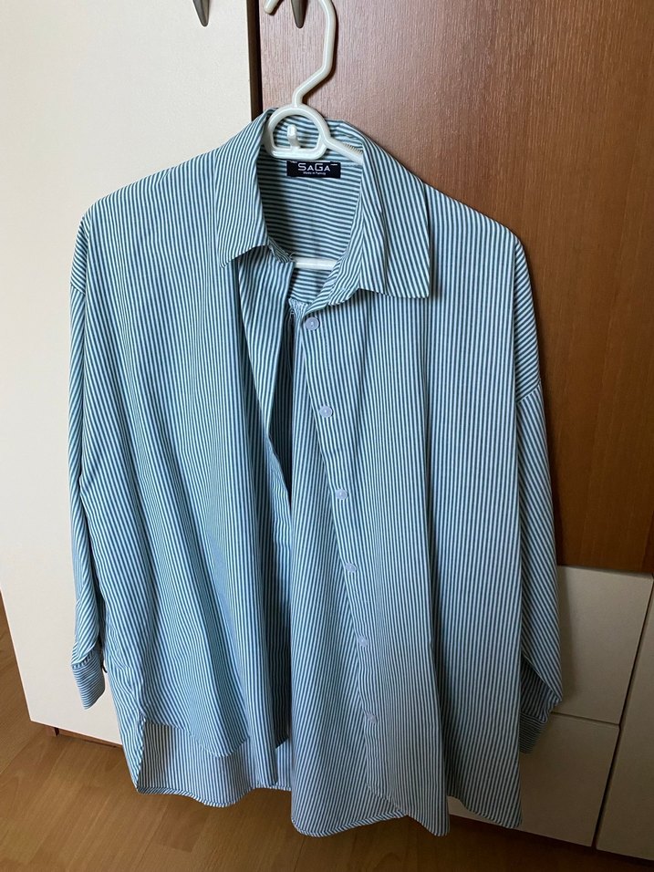 Yumuşak keten kumaştan, düğmeli ve yakalı, rahat kesim uzun kollu yeşil çizgili kadın gömleği. Günlük kullanıma uygundur.