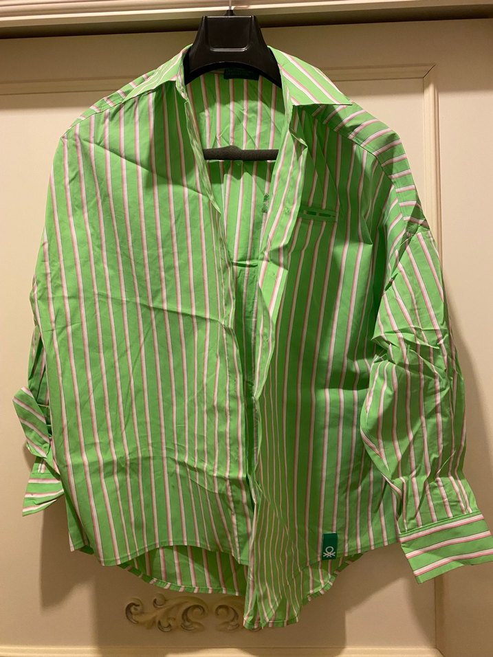 Düğmeli ve kesik yakalı, çizgili desenli, normal kesim, hafif yeşil uzun kollu gömlek. Yumuşak sentetik kumaştan, günlük rahat stil için uygun.