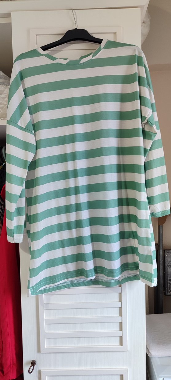 Yeşil beyaz çizgili, uzun kollu, kayık yaka ve bol kesim drapeli tunik. Yumuşak sentetik kumaştan, midi uzunlukta, günlük rahat stil için uygun.