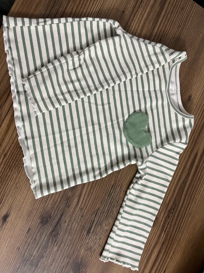 Yeşil çizgili, pamuklu, uzun kollu kız bluzu. Yuvarlak yakalı, düğmeli ve bol kesimdir. Üzerinde kalp detaylıdır. 3/4 yaş minik kalem ucu lekesi vardır görsele ekledim