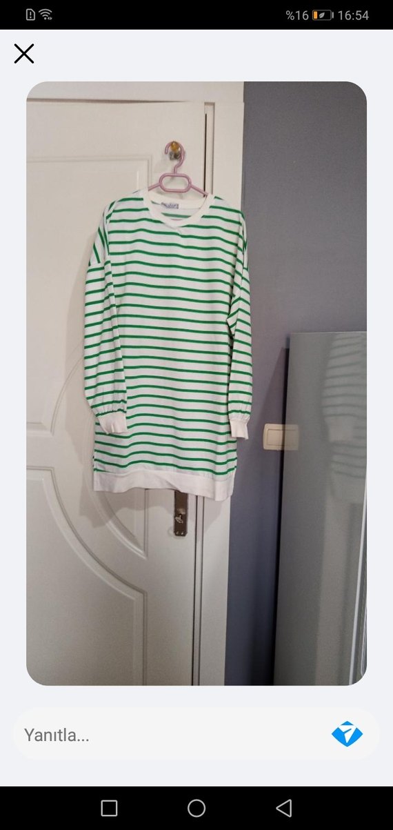 Uzun kollu, yuvarlak yaka, hafif yeşil çizgili, sentetik kumaştan, bol kesim kadın midi tunik. Günlük kullanım için zahmetsiz şıklık sunar.