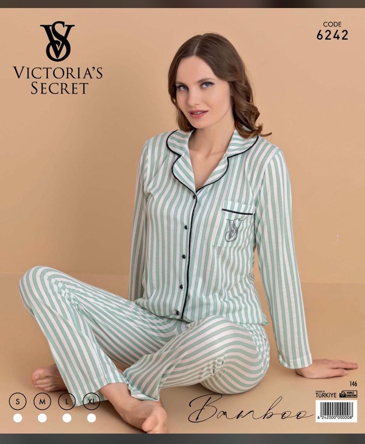 Victoria's Secret pijama takımı, uzun kollu ve normal boyda. Pastel yeşil zebra desenli, rahat ve modern tarzda bir tasarım.