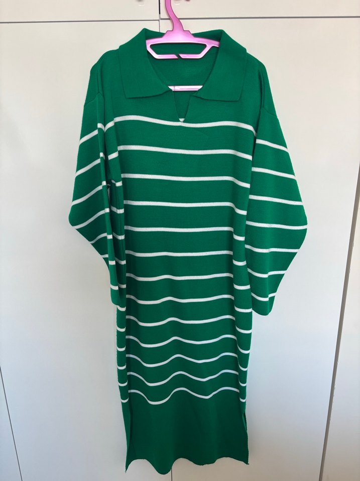 Yeşil renkte, uzun kollu, salaş kesim ve çizgili desenli triko elbisedir. Rahat ve renkli bir günlük kullanım seçeneğidir.