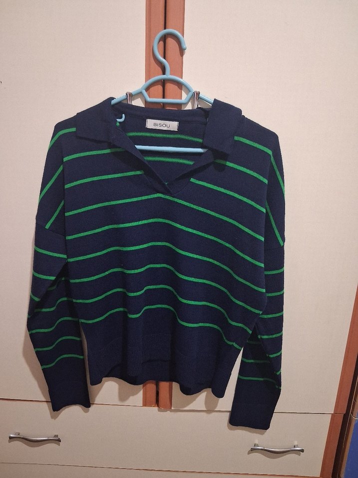 Yeşil çizgili, yakalı ve uzun kollu, triko kumaştan yapılmış, rahat kesime sahip günlük kullanıma uygun kazak. Standart bedendir xl a kadar uyumludur