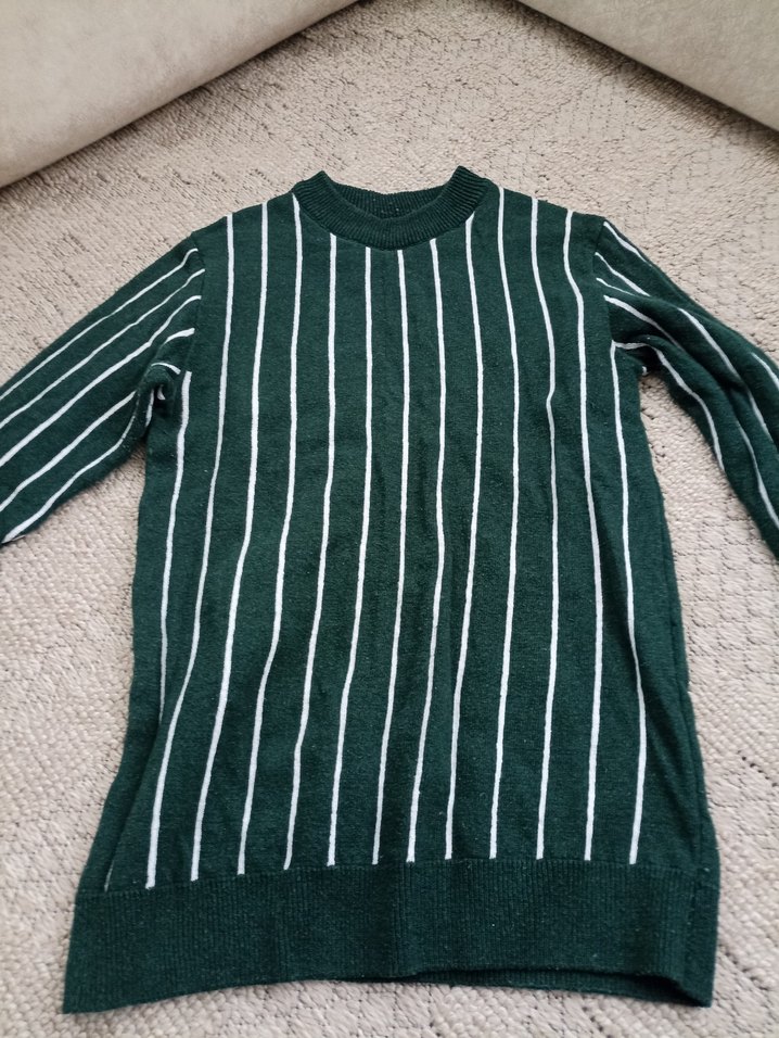 Yeşil renkli, uzun kollu ve bol kesim triko kazak. Dikey gri çizgiler ve yuvarlak yaka detaylarıyla günlük kullanıma uygun rahat bir model.