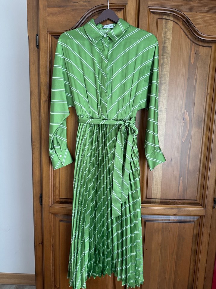 Uzun, yeşil çizgili elbise pliseli detaylara, yakalı yaka ve uzun kollara sahiptir. Belden bağlamalı, ofis için uygundur.
