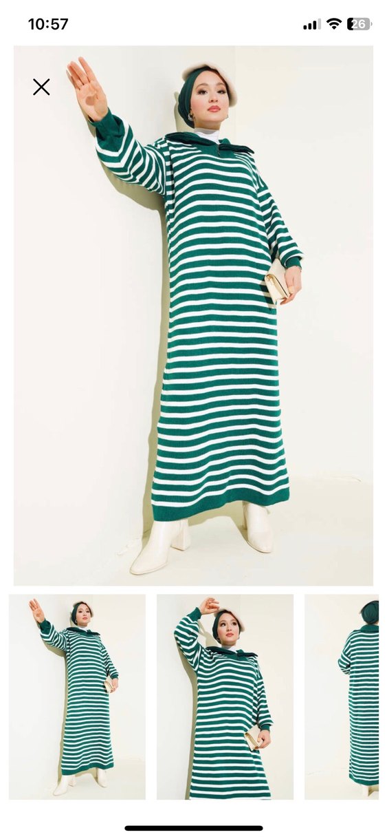 Uzun boy, yüksek yakalı ve uzun kollu, rahat kesimli yeşil-beyaz çizgili triko elbise, günlük kullanım için uygundur.
