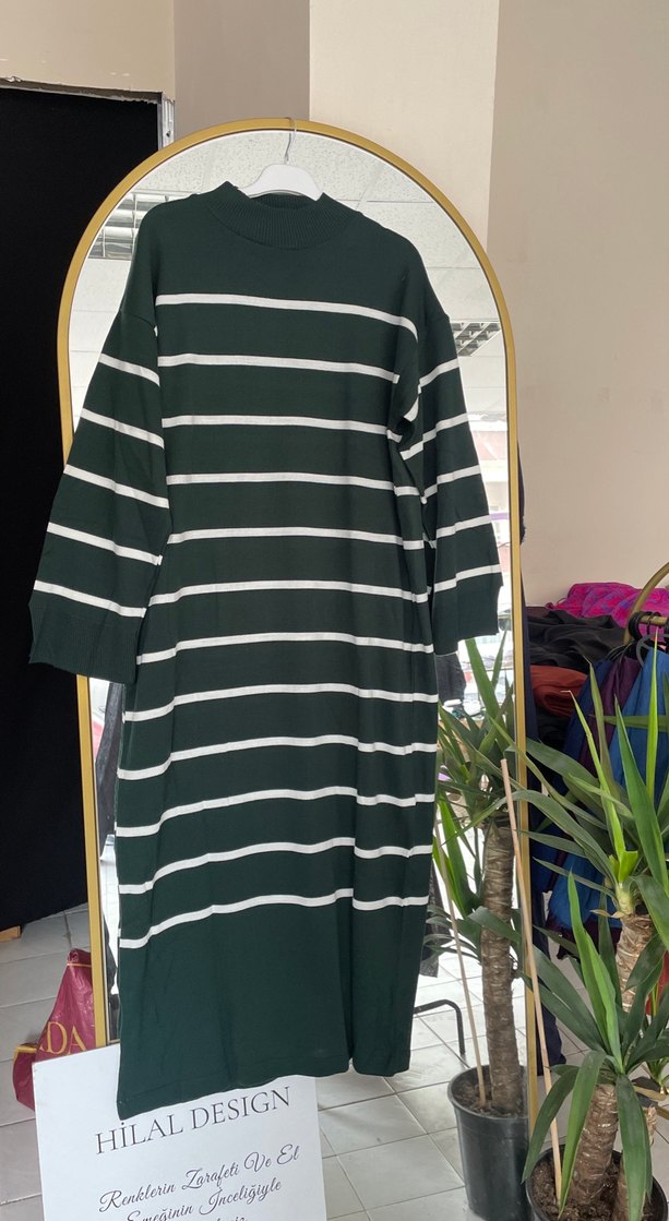 Yeşil renkli, uzun kollu, yuvarlak yakalı, beyaz çizgili, bol kesim triko elbisedir. Günlük rahat sokak stiline uygundur.
