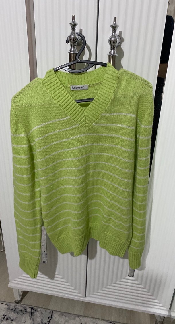 Beyaz çizgili açık yeşil triko kazak, V yaka ve uzun kollu. Rahat kesim ve midi boyda, günlük kullanıma uygun. 1 kere giydim