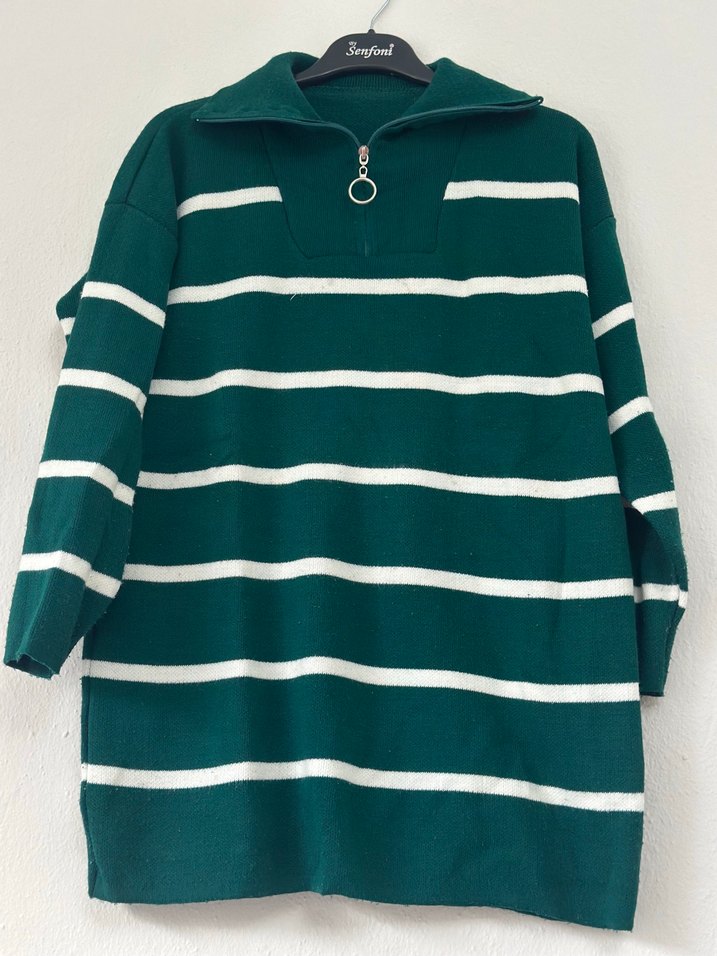 Yeşil renkli, uzun kollu, yarım fermuarlı yüksek yakalı, çizgili triko kazak. Rahat kesimi ve örgü dokusu ile günlük kullanıma uygundur. ✨