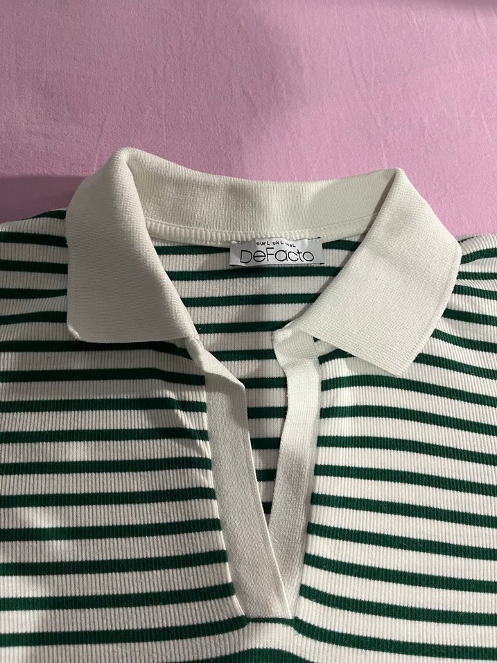 Pamuklu, düğmeli yakalı ve kısa kollu, yeşil çizgili fitted kız polo tişört