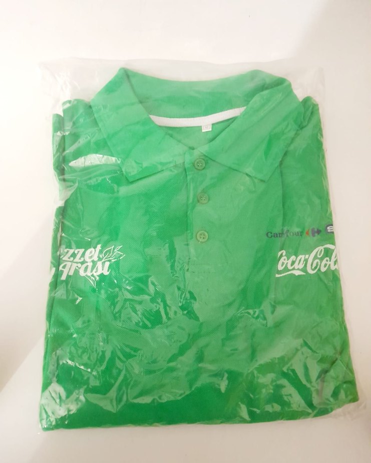 Renkli baskılı logolar ve fermuarlı detaylı, yeşil kısa kollu polo tişört. Plastik malzemeden, rahat kesim ve normal boyda. Coca-Cola markalı.