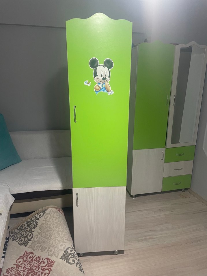 Yeşil çocuk odası takımı. Küçük kusurları vardır.dolap içinde küsür yoktur. Dış kısımlarında ufak tefek kusurlar vardır. gelip alınması gerekiyor.
