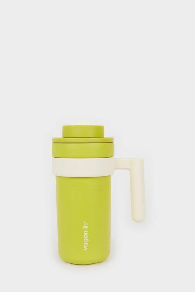 Yeşil renkli çocuk termos bardak, kolay kullanım için saplı ve kapaklıdır. İçecekleri sıcak tutar, renkli ve pratiktir.