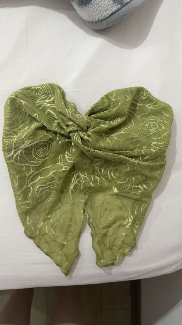 Parlak sentetik kumaştan, vintage esintili çiçek desenli yeşil kadın fular, fiyonk detaylı. Bohem stil için uygun.
