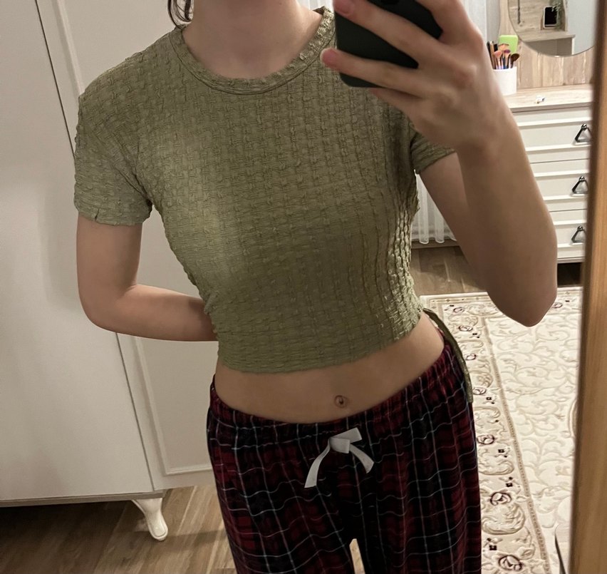 Düğmeli, kısa kollu, yuvarlak yakalı yeşil crop top. Yumuşak örme kumaştan, gündelik ve rahat tarz için uygun.