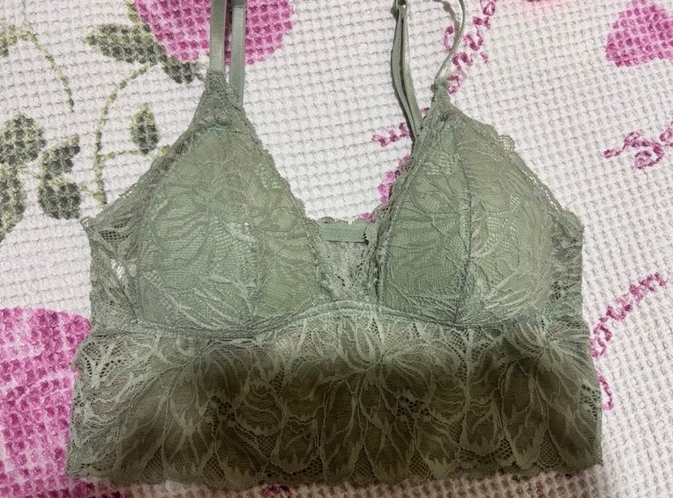 Pastel yeşil renkte, ayarlanabilir askılı, yumuşak dantel kumaştan bohem tarzda bralet.