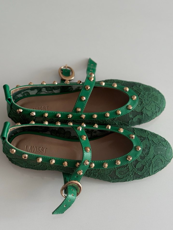Yeşil renkli, dantel detaylı ve blok topuklu kadın babet. Altın renkli çivilerle süslenmiş, yılan derisi desenli ve punk tarzında. Renkli ve günlük kullanıma uygun.