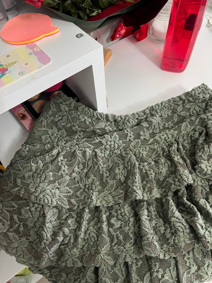 Yeşil renkli,dantel işlemeli ve bol kesim mini etek.Rahat ve bohem bir tarz sunar.Bir kere giyilmiştir.