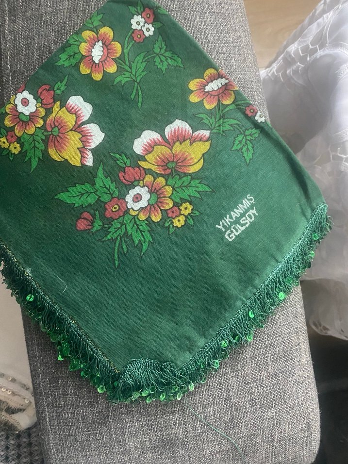 Yeşil renkli, parlak çiçek desenli ve dantel detaylı bohem tarzı kadın fuları. Üzerinde 'YIKANMAY GÜLSOY' yazısı bulunur.