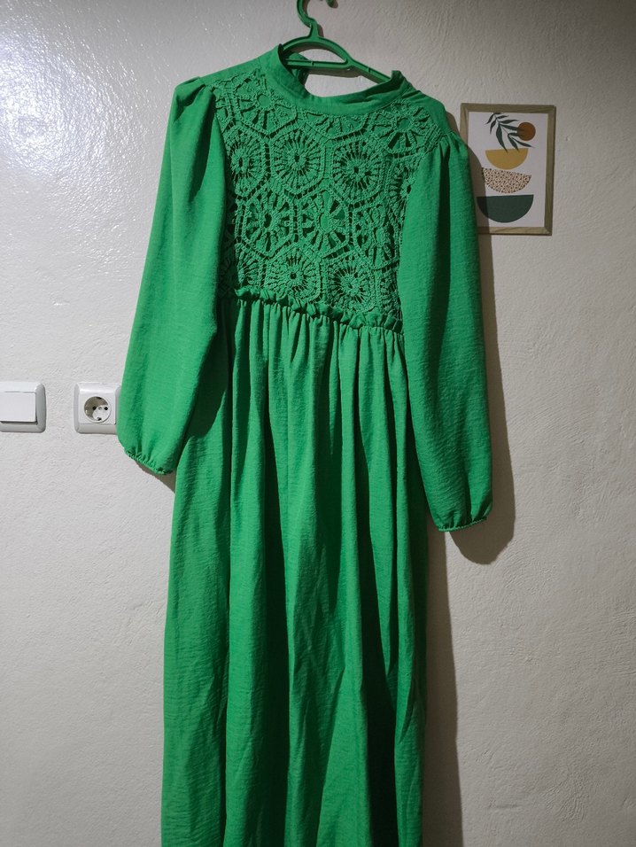 Bu koyu yeşil uzun elbise, dantel işlemeli detaylara sahip bol kesimdir. Yuvarlak yaka ve uzun kolludur, bohem tarzını yansıtır. 2 defa giyildi 70 kiloya kadar olur.